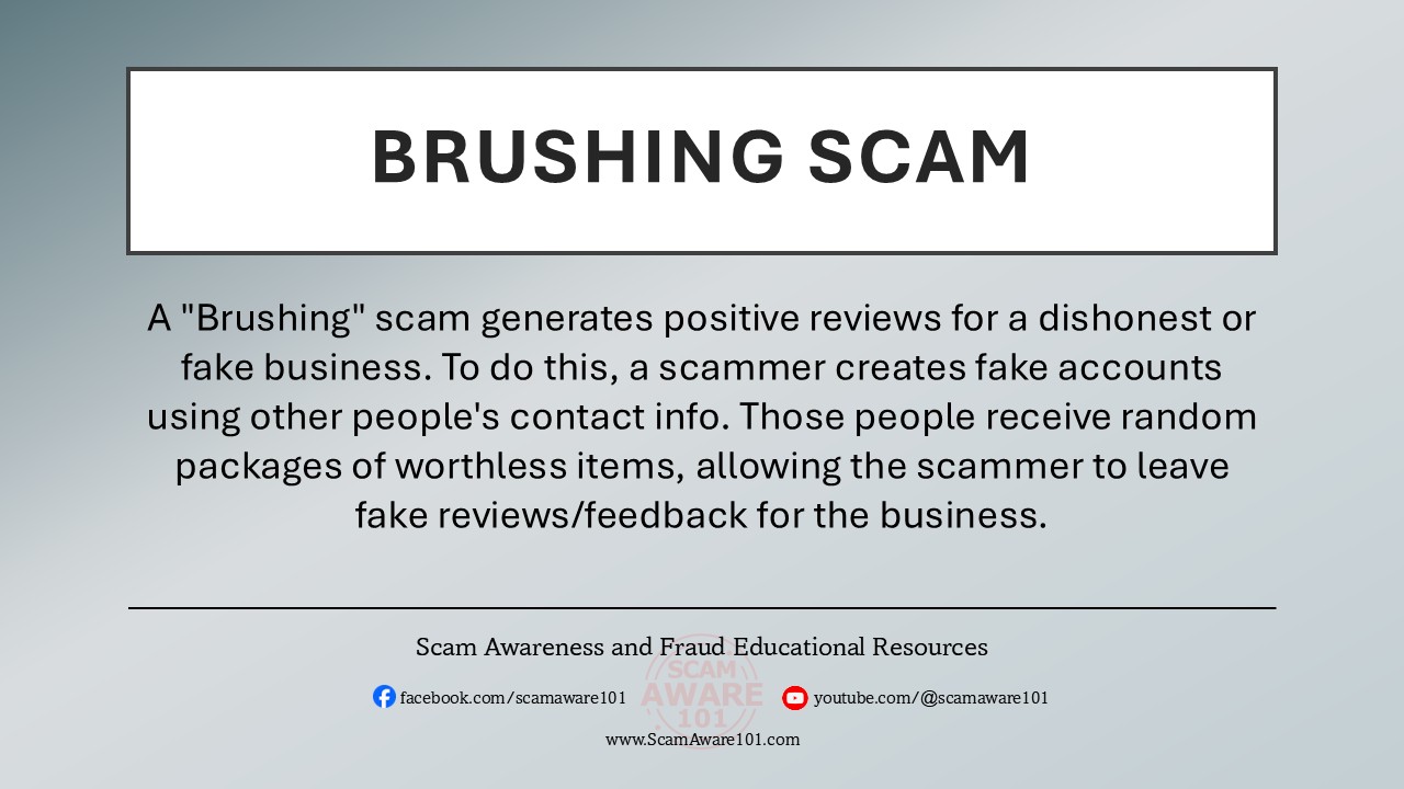 A "Brushing" scam generates positive reviews for a dishonest or fake business. To do this, a scammer creates fake accounts using other people's contact info. Those people receive random packages of worthless items, allowing the scammer to leave fake reviews/feedback for the business.