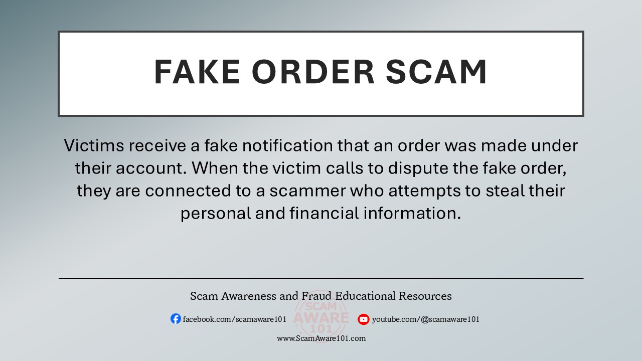 Victims receive a fake notification that an order was made under their account. When the victim calls to dispute the fake order, they are connected to a scammer who attempts to steal their personal and financial information.