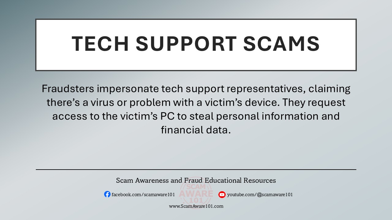 Fraudsters impersonate tech support representatives, claiming there's a virus or problem with a victim's device. They request access to the victim's PC to steal personal information and financial data.