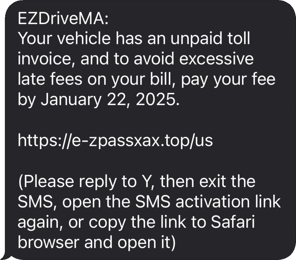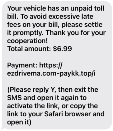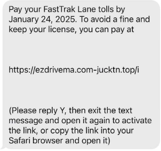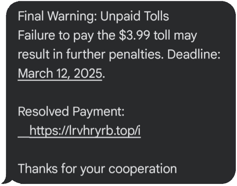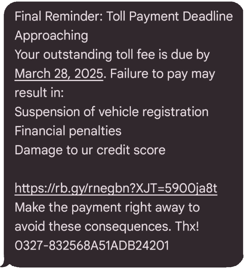 Victims are contacted about unpaid tolls and asked to pay quickly through a link or risk penalties. These scams exploit urgency and fear of fines.