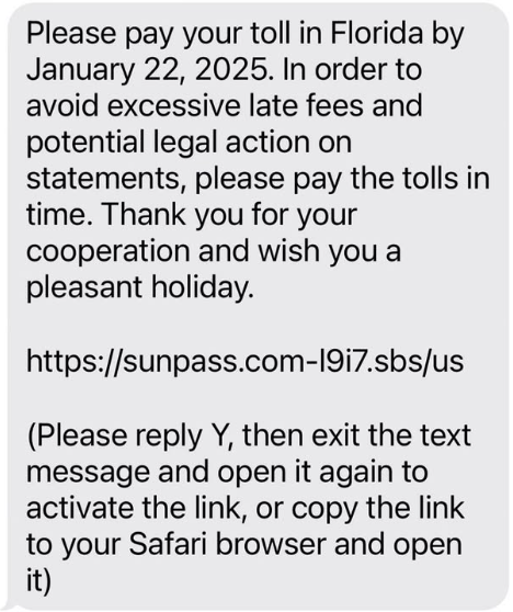 Please pay your toll in Florida by January 22, 2025. In order to avoid excessive late fees and potential legal action on statements, please pay the tolls in time. Thank you for your cooperation and wish you a pleasant holiday.