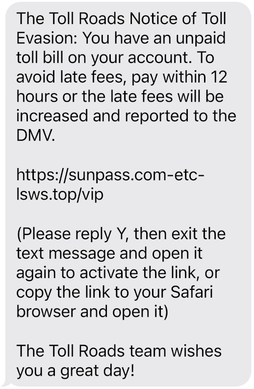 The Toll Roads Notice of Toll Evasion: You have an unpaid toll bill on your account. To avoid late fees, pay within 12 hours or the late fees will be increased and reported to the DMV.