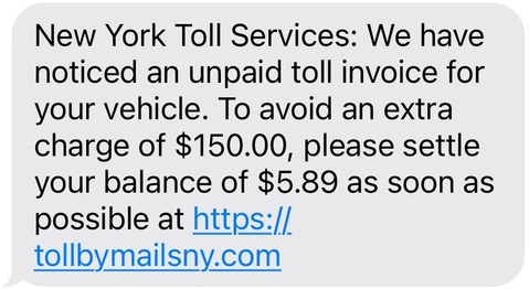 New York Toll Services: We have noticed an unpaid toll invoice for your vehicle. To avoid an extra charge of $150.00, please settle your balance of $5.89 as soon as possible at https://[url-removed]
