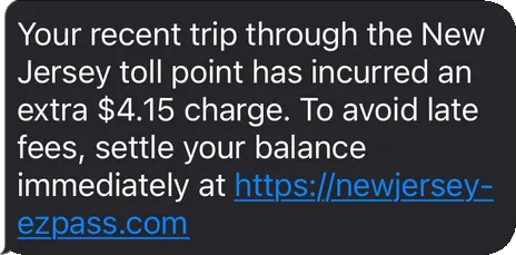 Your recent trip through the New Jersey toll point has incurred an extra $4.15 charge. To avoid late fees, settle your balance immediately at https://[url-removed]