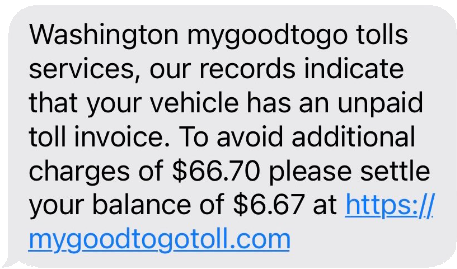Washington mygoodtogo tolls services, our records indicate that your vehicle has an unpaid toll invoice. To avoid additional charges of $66.70 please settle your balance of $6.67 at https://[url-removed]